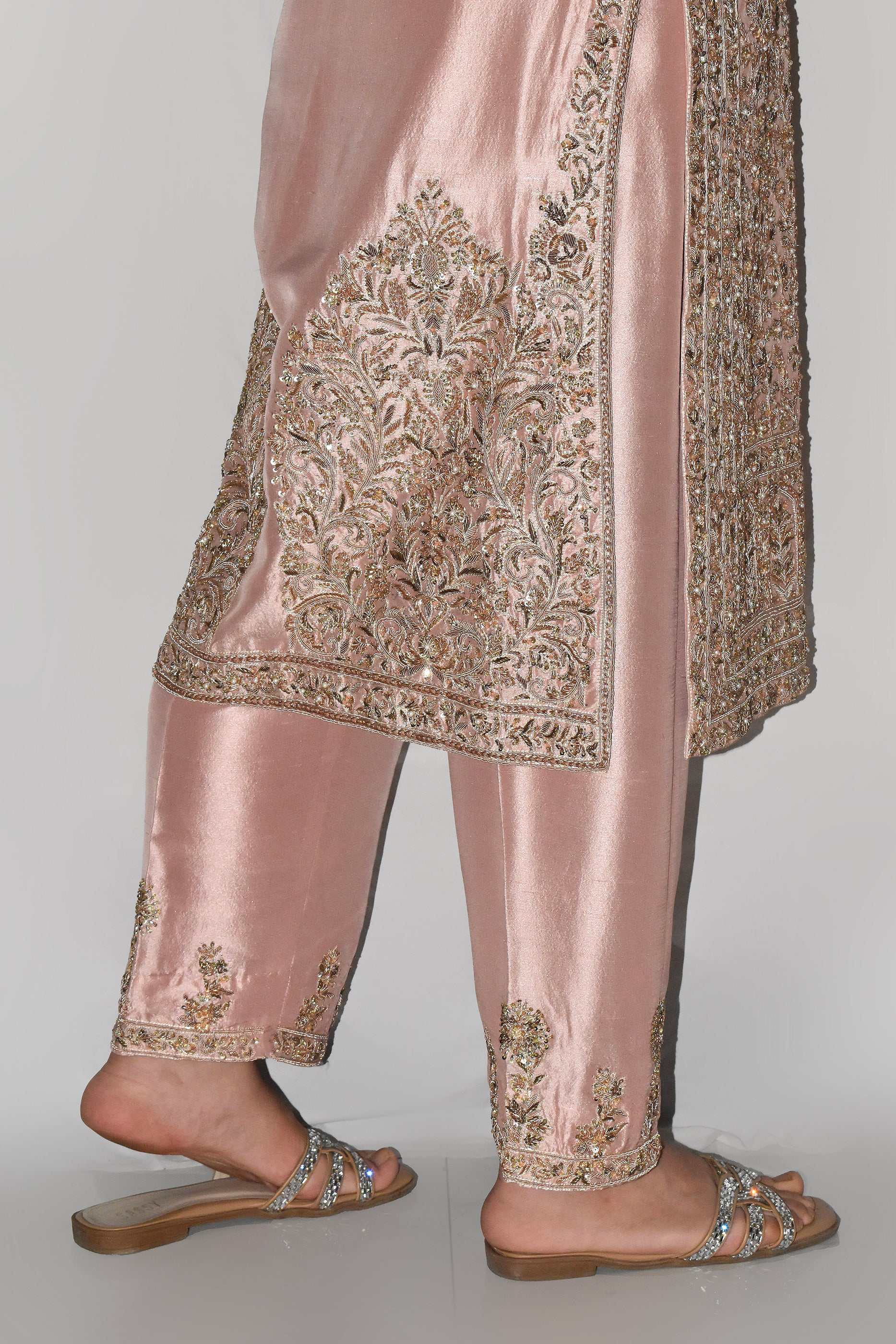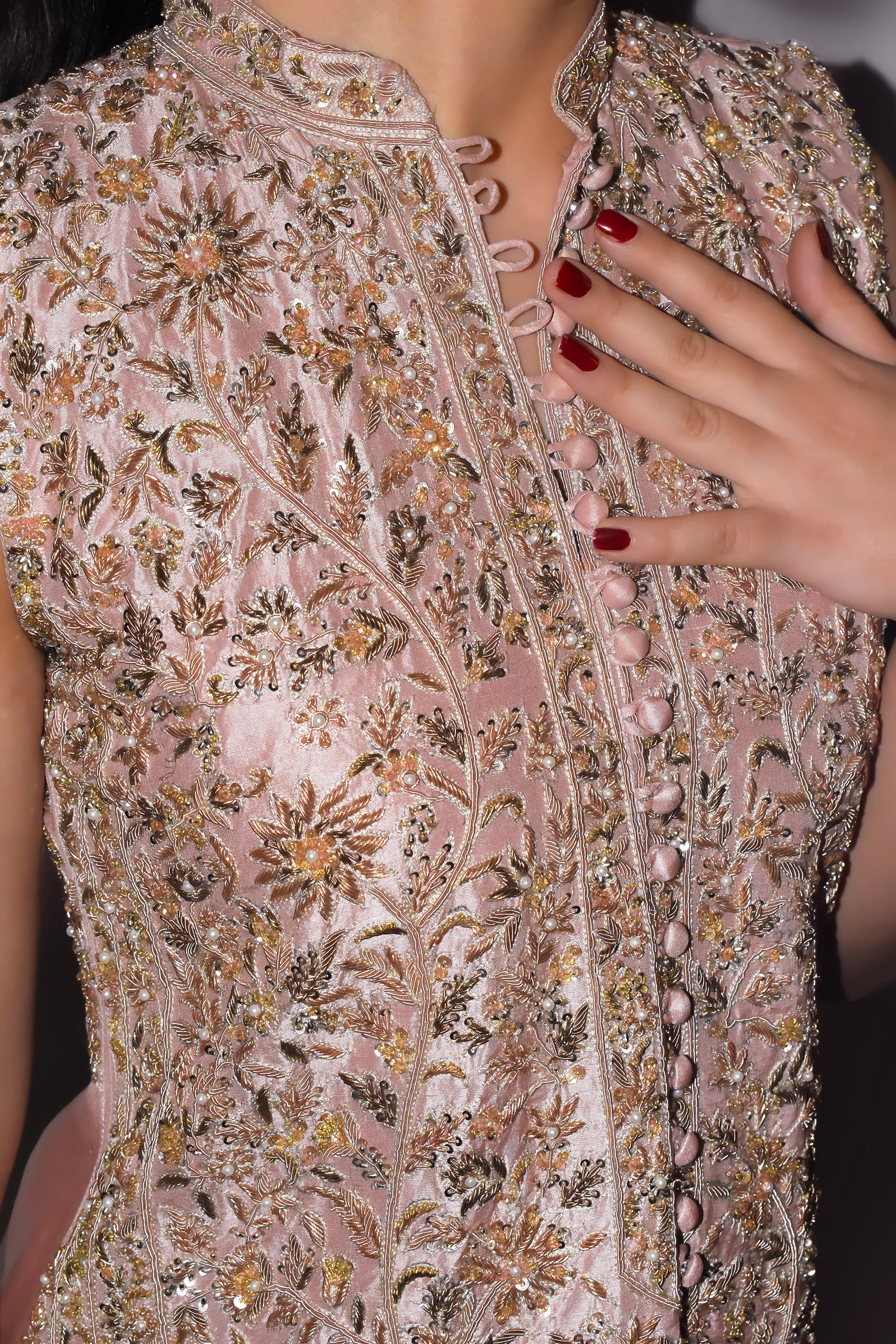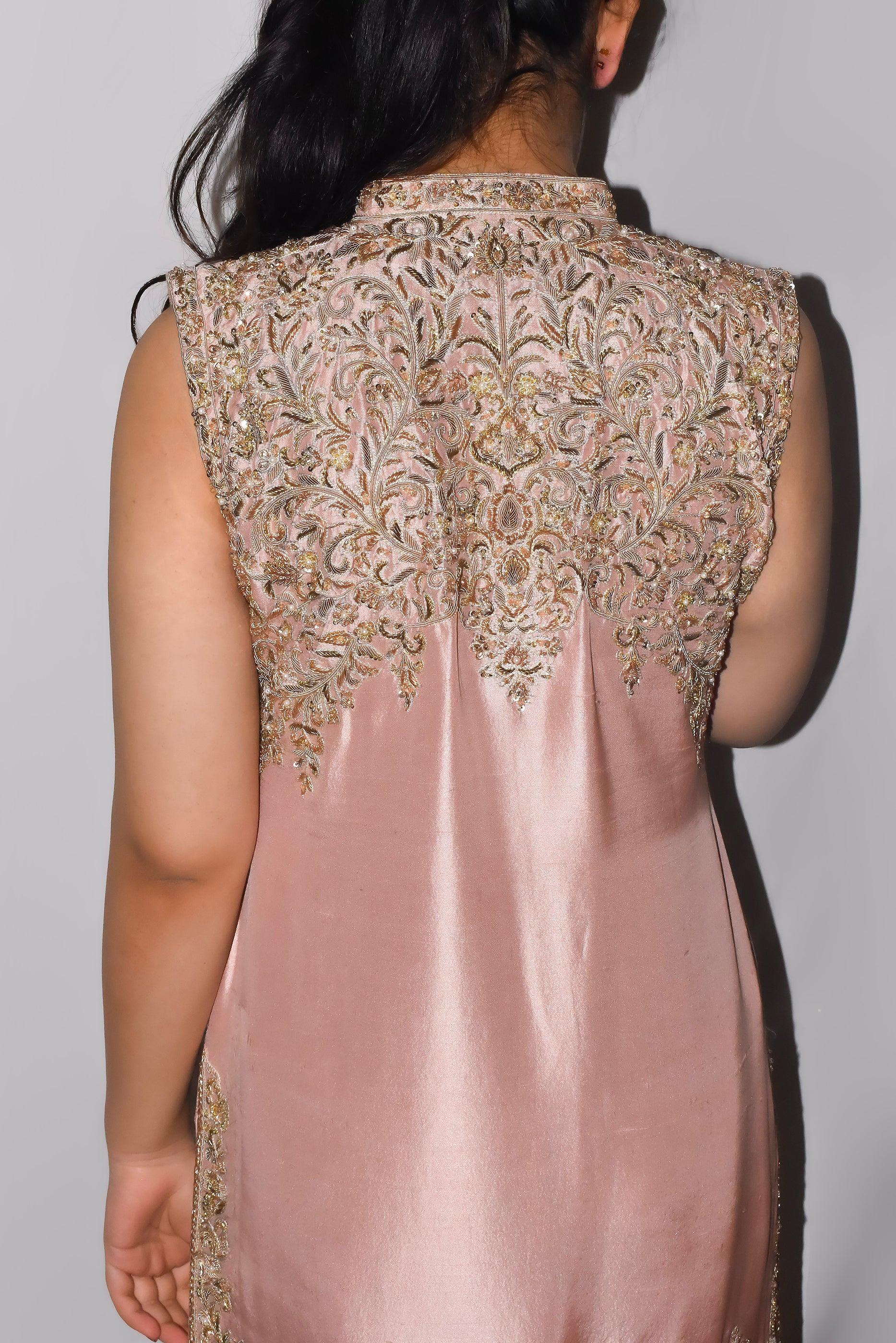 Blush-pink raw silk shapes into a sleeveless gown with a band collar and covered buttons. The front is worked from top to hem in antique-gold tilla, sequins, and crystals; it’s vines and florals held within slim vertical panels. At the base, arched jharoka motifs sit over a compact floral border.